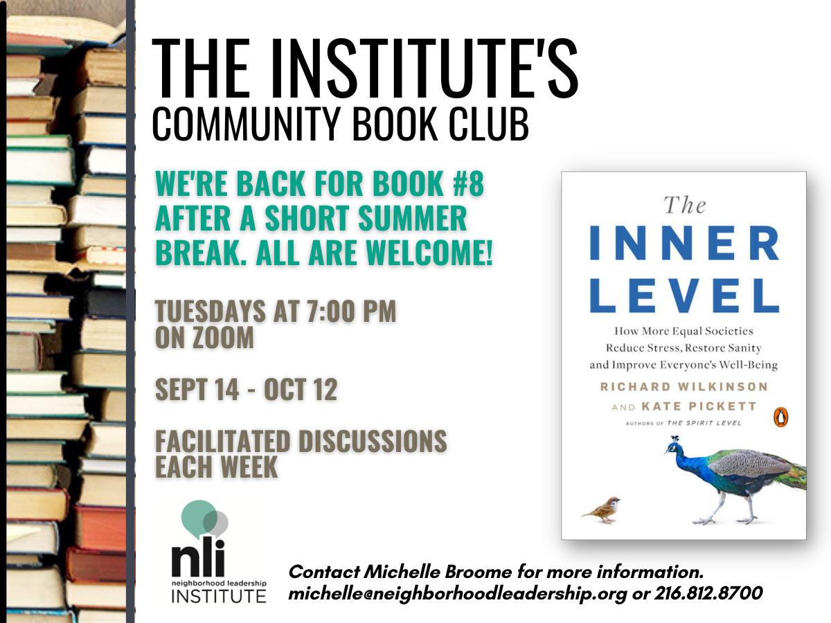 The Inner Level: How More Equal Societies Reduce Stress, Restore Sanity and Improve Everyone’s Well-Being by Richard Wilkinson and Kate Pickett is the 8th book in Neighborhood Leadership Institute’s Community Book Club. Hundreds of community members have contributed to ongoing dialogue on social justice in previous groups and we invite you to join as well. These Book Club discussions begin Tuesday September 14th. The group will convene weekly until October 12th. Guests will participate in discussions led by NLI facilitator GiGi Elder. Participants should be ready to discuss the Introduction and Chapters 1 & 2 at the first session.